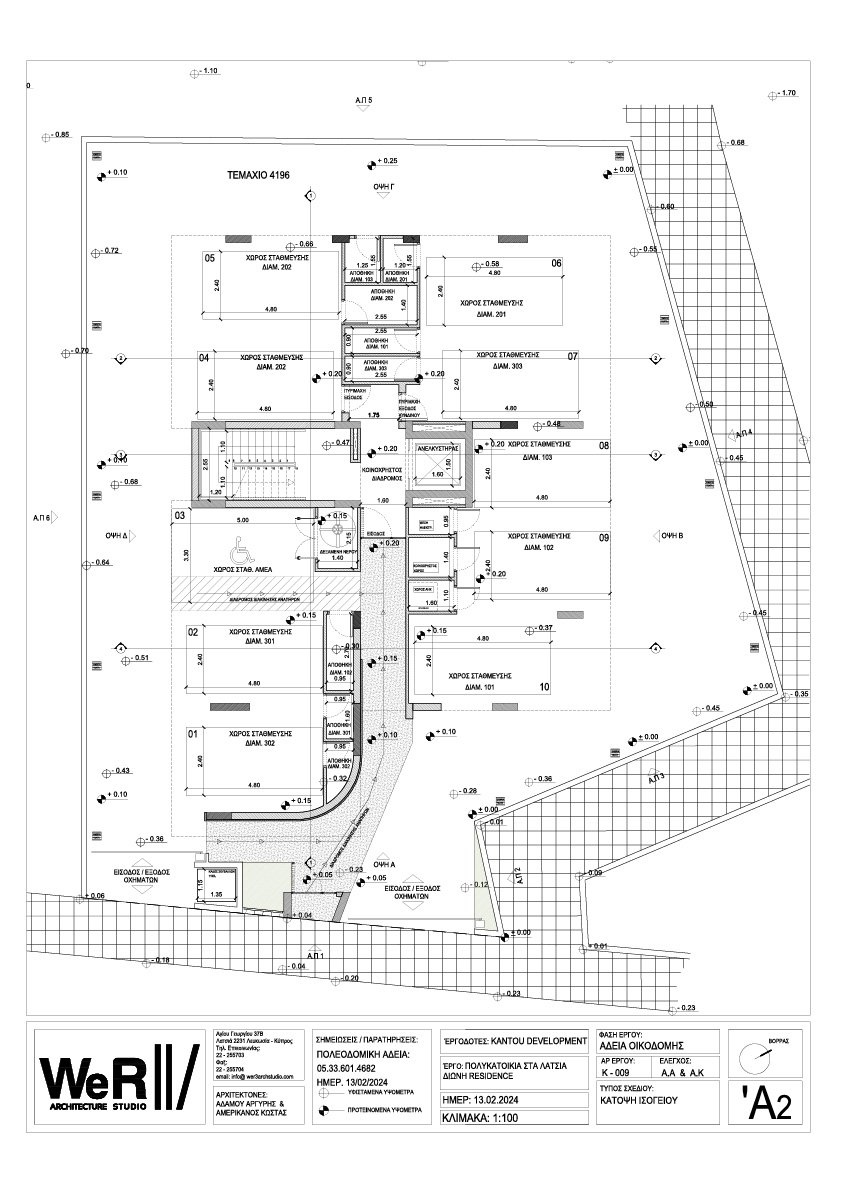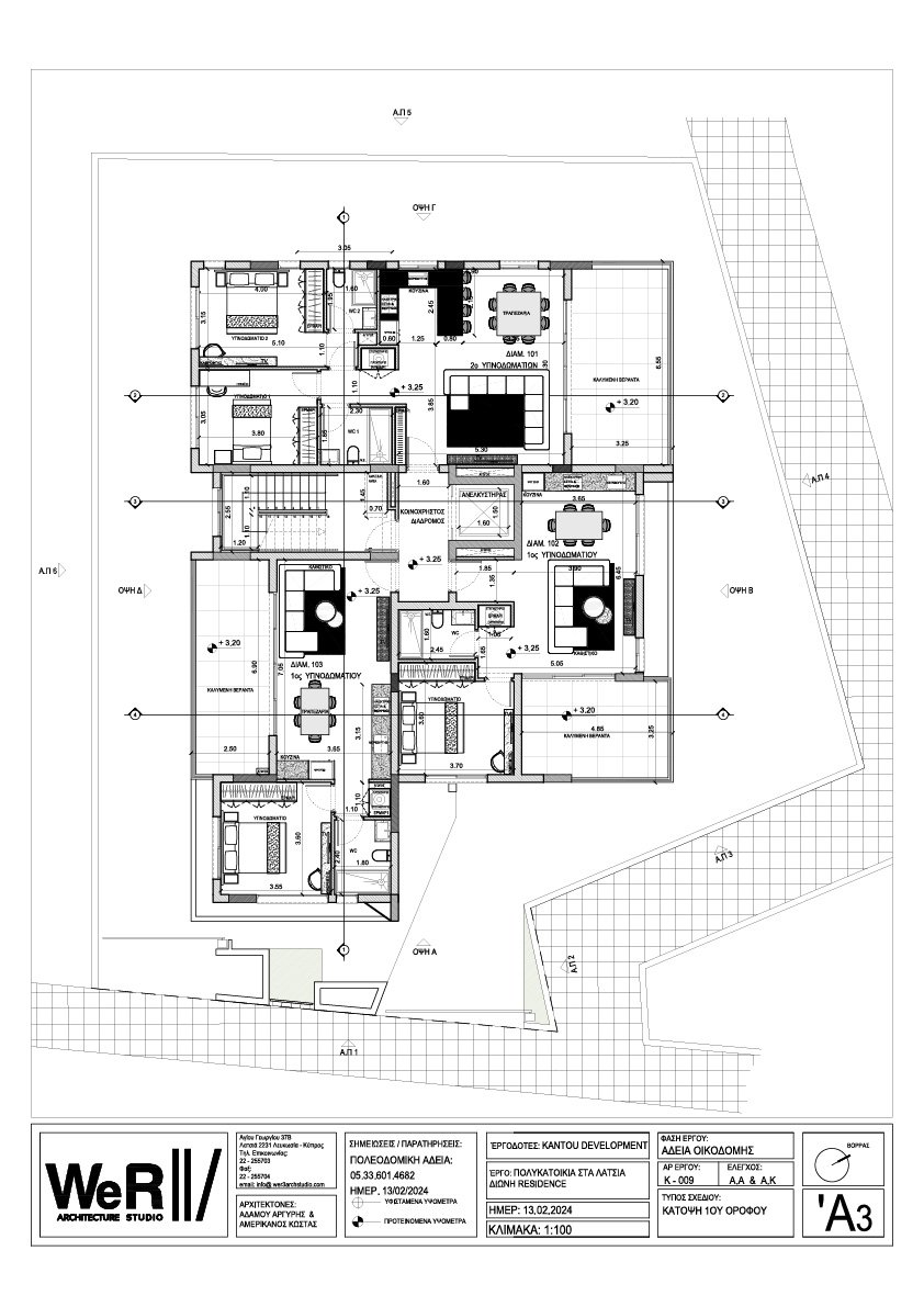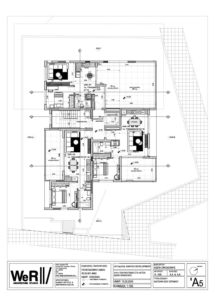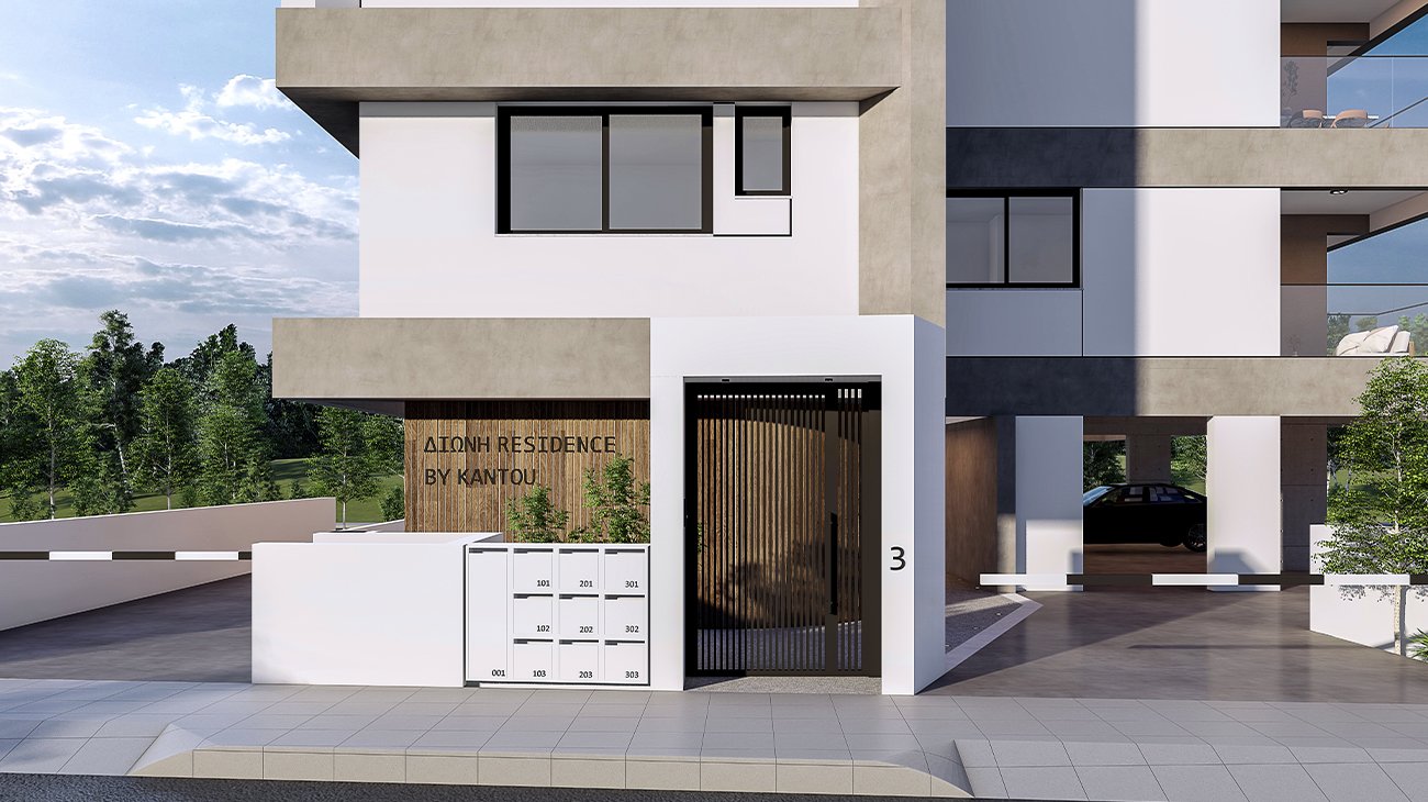 Τριώροφη πολυκατοικία που αριθμεί 8 διαμερίσματα. Ο πρώτος όροφος αποτελείται από ένα δυάρι και δύο μονάρια, ο δεύτερος όροφος από ένα δυάρι και ένα τριάρι και ο τρίτος όροφος από τρία μονάρια.
