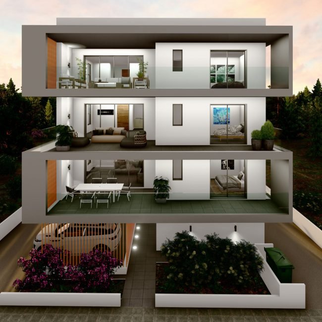 Όλα τα διαμερίσματα διαθέτουν μπαλκόνι, χώρο στάθμευσης και αποθήκη.